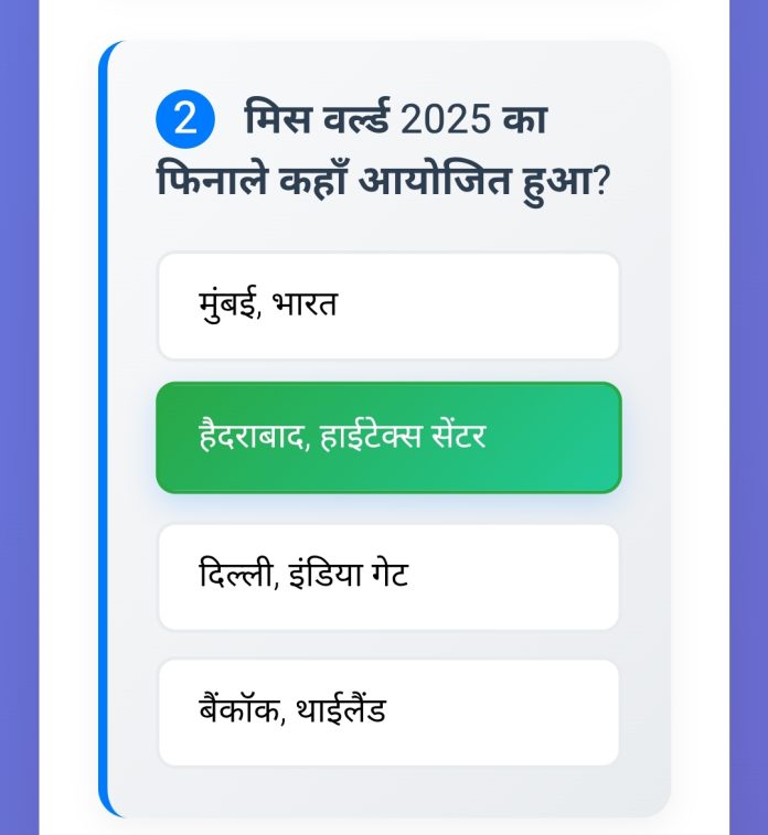 HomeCurrent affairsCurrent Affairs Quiz Current affairs Current Affairs Quiz By govtjobhindi1994 June 1, 2025 0 72 Share FacebookTwitterPinterestWhatsApp Table of Contents Toggle 🧠 Current Affairs Quiz1मिस वर्ल्ड 2025 की विजेता कौन बनी है?2मिस वर्ल्ड 2025 का फिनाले कहाँ आयोजित हुआ?3विश्व तंबाकू निषेध दिवस 2025 की थीम क्या थी?4भारत-मंगोलिया संयुक्त सैन्य अभ्यास का नाम क्या है?5सद्गुरु को कौन सा पुरस्कार मिला है?6विश्वनाथ कार्तिकेय पादकांति की उम्र कितनी है?7एक्वाडक्ट ब्रिज परियोजना में कौन सी नदी का पानी कहाँ छोड़ा जाएगा?8नोमैडिक एलीफेंट अभ्यास कहाँ आयोजित हो रहा है? 🧠 Current Affairs Quiz Test your knowledge of recent events 1मिस वर्ल्ड 2025 की विजेता कौन बनी है? ओपल सुजाता (थाईलैंड) नंदिनी गुप्ता (भारत) मारिया गार्सिया (फिलीपींस) सोफिया रोड्रिगेज (कोलंबिया) 2मिस वर्ल्ड 2025 का फिनाले कहाँ आयोजित हुआ? मुंबई, भारत हैदराबाद, हाईटेक्स सेंटर दिल्ली, इंडिया गेट बैंकॉक, थाईलैंड 3विश्व तंबाकू निषेध दिवस 2025 की थीम क्या थी? Tobacco Free World Stop Smoking Today Bright products. Dark intentions. Unmasking the Appeal Quit Tobacco Now 4भारत-मंगोलिया संयुक्त सैन्य अभ्यास का नाम क्या है? नोमैडिक एलीफेंट डेजर्ट ईगल माउंटेन वॉरियर स्टेप्स गार्डियन 5सद्गुरु को कौन सा पुरस्कार मिला है? पद्म विभूषण ग्लोबल इंडियन ऑफ द ईयर नोबेल शांति पुरस्कार यूएन एनवायरनमेंट अवार्ड 6विश्वनाथ कार्तिकेय पादकांति की उम्र कितनी है? 14 वर्ष 15 वर्ष 17 वर्ष 16 वर्ष 7एक्वाडक्ट ब्रिज परियोजना में कौन सी नदी का पानी कहाँ छोड़ा जाएगा? यमुना नदी में गंगा का पानी गंगा नदी में यमुना का पानी मेज नदी में कालीसिंध का पानी चंबल नदी में बनास का पानी 8नोमैडिक एलीफेंट अभ्यास कहाँ आयोजित हो रहा है? नई दिल्ली, भारत उलानबटार, मंगोलिया लद्दाख, भारत होवड, मंगोलिया 0/8 आपका स्कोर फिर से शुरू करें Share FacebookTwitterPinterestWhatsApp Previous articleसमसामयिकी प्रश्नोत्तरी 2025Next articleभारत की नई रामसर साइट्स (2025) govtjobhindi1994https://govtjobhindi.com RELATED ARTICLES Current affairs करंट अफेयर्स June 6, 2025 Current affairs भारत की नई रामसर साइट्स (2025) June 6, 2025 Current affairs समसामयिकी प्रश्नोत्तरी 2025 June 1, 2025 LEAVE A REPLY Cancel reply Comment: Please enter your comment! Name:* Please enter your name here Email:* You have entered an incorrect email address! Please enter your email address here Website: Save my name, email, and website in this browser for the next time I comment. - Advertisment - Most Popular करंट अफेयर्स June 6, 2025 भारत की नई रामसर साइट्स (2025) June 6, 2025 समसामयिकी प्रश्नोत्तरी 2025 June 1, 2025 National current affairs June 1, 2025 Load more Recent Comments